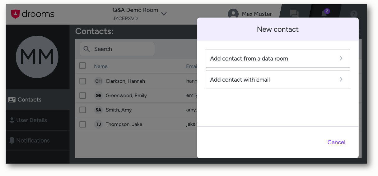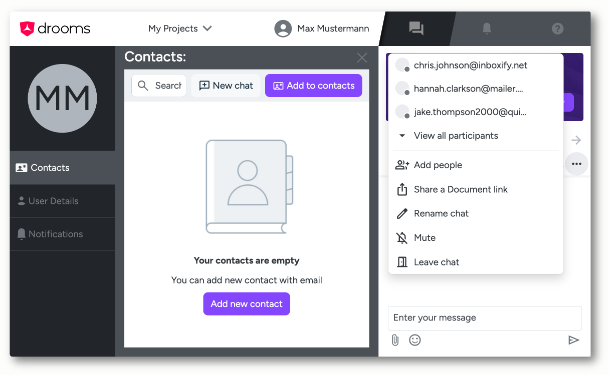 Contacts are essential for chatting. The Drooms Chat offers following features for adding and managing contacts: