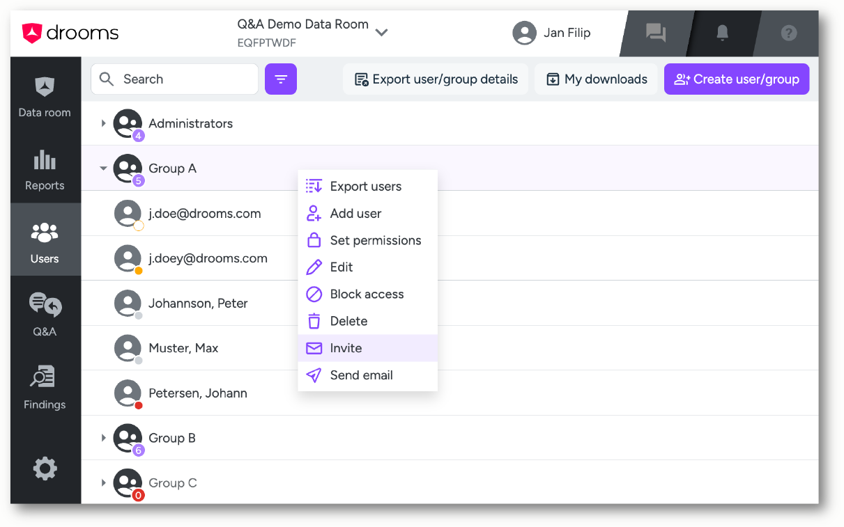 If necessary you can move users from one group to another. To move users, proceed as follows: After signing in to Drooms, select the project and data room where you want to move users. Select 'Users' in the project's and data room's tab bar to access ...